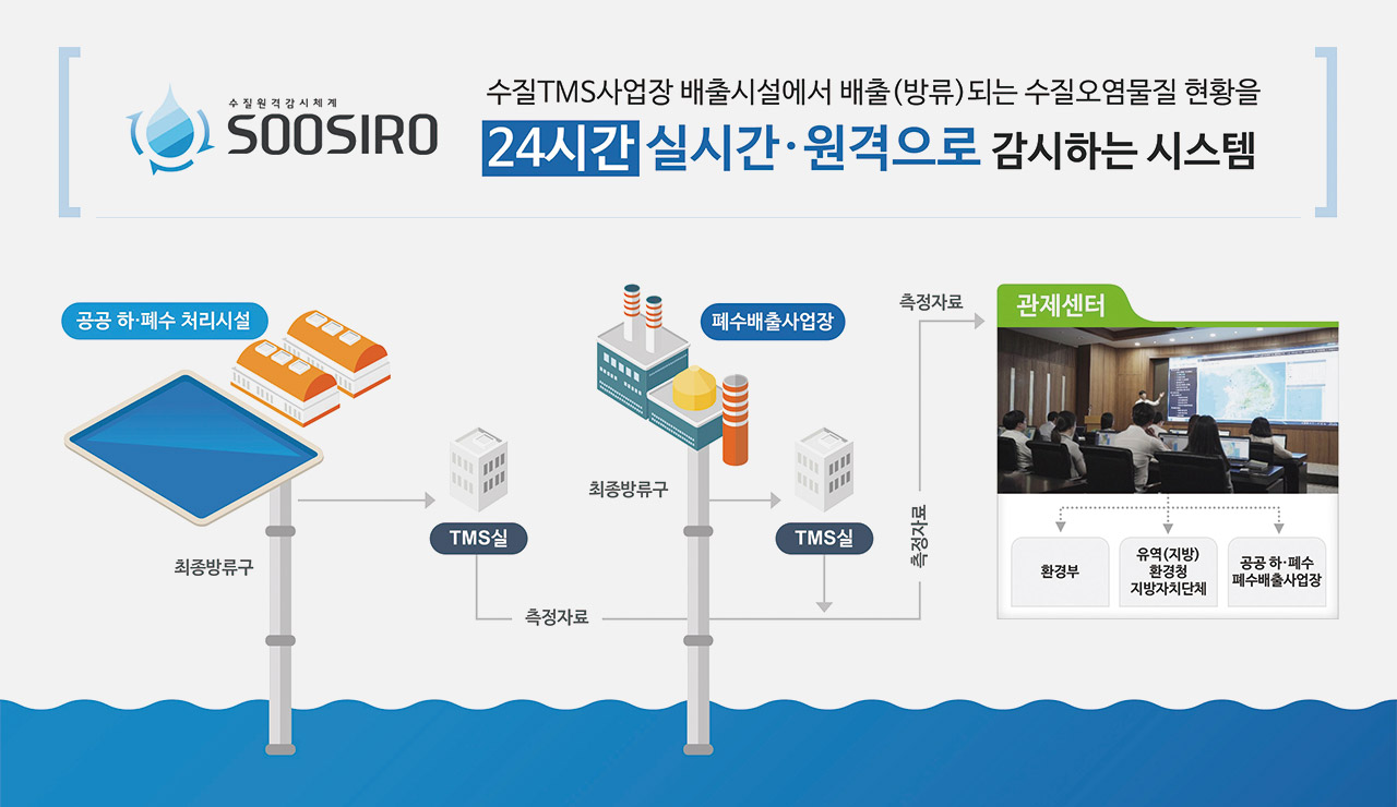 수질원격감시체계(TMS)는 공공하수처리시설, 공공폐수처리시설, 폐수배출사업장 등에서 배출되는 수질오염물질을 24시간 실시간으로 원격 감시하는 시스템이다.
