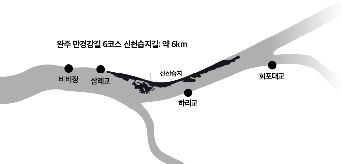 만경강길을 따라 걸으면 회포대교 부근에서 두 하천이 합류해 새로운 생태 공간을 이루는 모습을 만날 수 있다. 소양천과 고산천이 만나 하천이 넓어지면서 물이 천천히 흘러 자갈과 모래가 겹겹이 쌓인 작은 섬들이