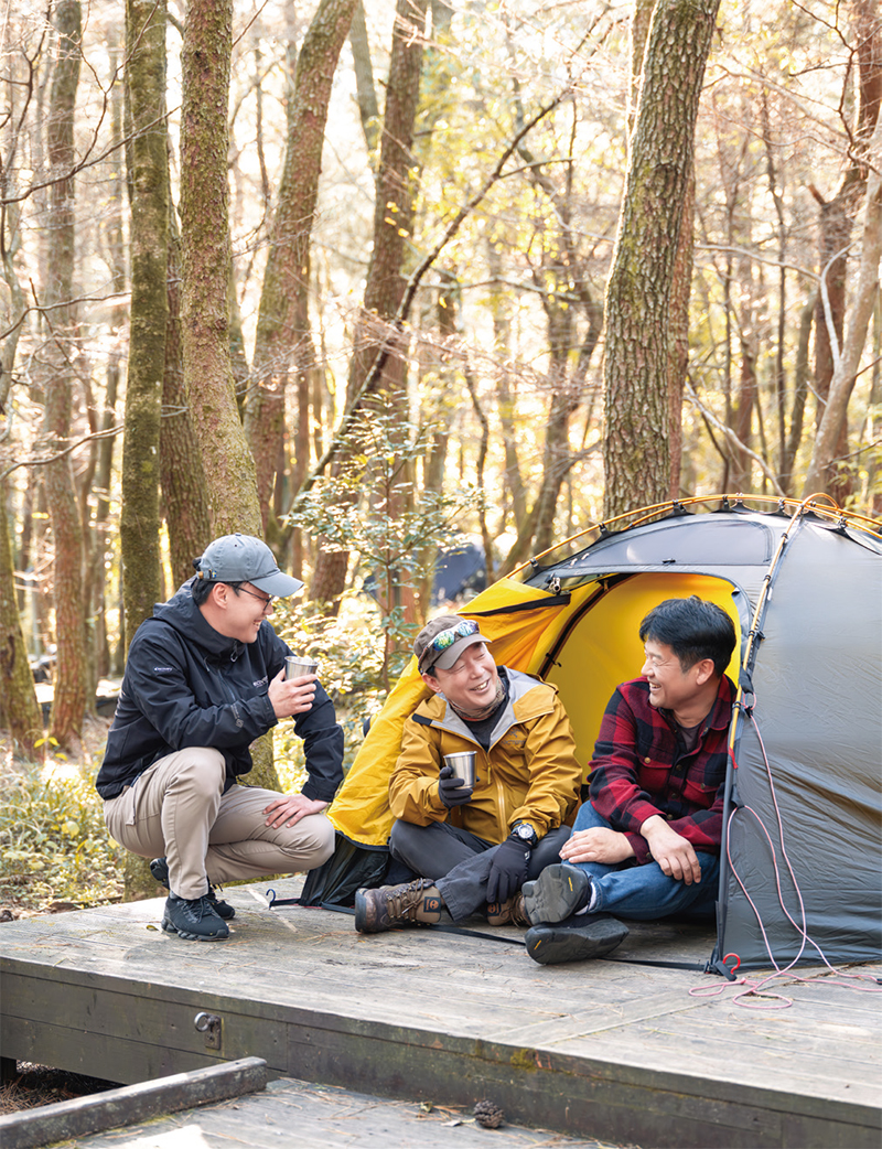공기 속에서 상쾌한 숲 향이 퍼졌고, 묵직한 배낭을 메고 걸음을 내딛는 회원들의 얼굴에는 기대와 설렘이 어렸다. 회원들은 데크에 배낭을 내려놓고 곧장 손에 익은 동작으로 필요한 물품을 꺼냈다. 텐트를 세우고 야영